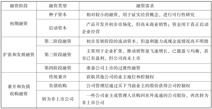 表10-1 简要说明了在企业的不同融资阶段可选择的主要融资类型。在经历了初创期后,企业进一步成长的阶段性融资将主要集中于扩张和发展融资、兼并和负债收购融资两种类型。