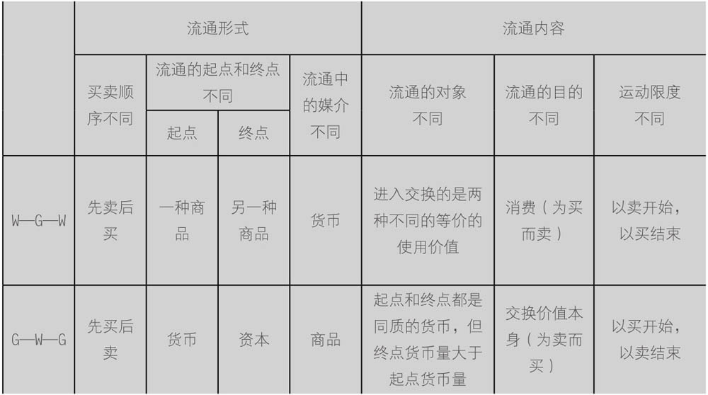 商品流通的直接形式是:W(商品)—G(货币)—W(商品),它代表商品转化为货币,货币再转化为商品,为买而卖;除此之外,还有一种完全不同的形式:G(货币)—W(商品)—G(货币),它表示货币先转化为商品,商品再转化为货币,是为卖而买。