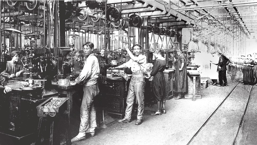 在资本主义条件下,劳动过程就是资本家消费劳动力的过程。而劳动力商品的价值,与劳动力供给市场的饱和度有很大关系,饱和度越大,劳动力价值越小。在法国,很多在大战期间招募的中国劳工受雇于兵工厂,更多的人被分配从事危险工作,比如挖战壕和掩埋尸体。图为中国劳工在法国兵工厂工作。