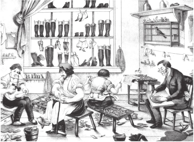 在工场手工业的分工协作中,每个工人都只完成一种中间制品,最后的成品则是他们特殊劳动的结合产品。局部工人不生产商品,变成商品的只是局部工人生产的共同产品。在图中的这家制鞋工场内,磨皮、制模、缝线、下料等工序分别由不同的工人完成,这就是分工协作。