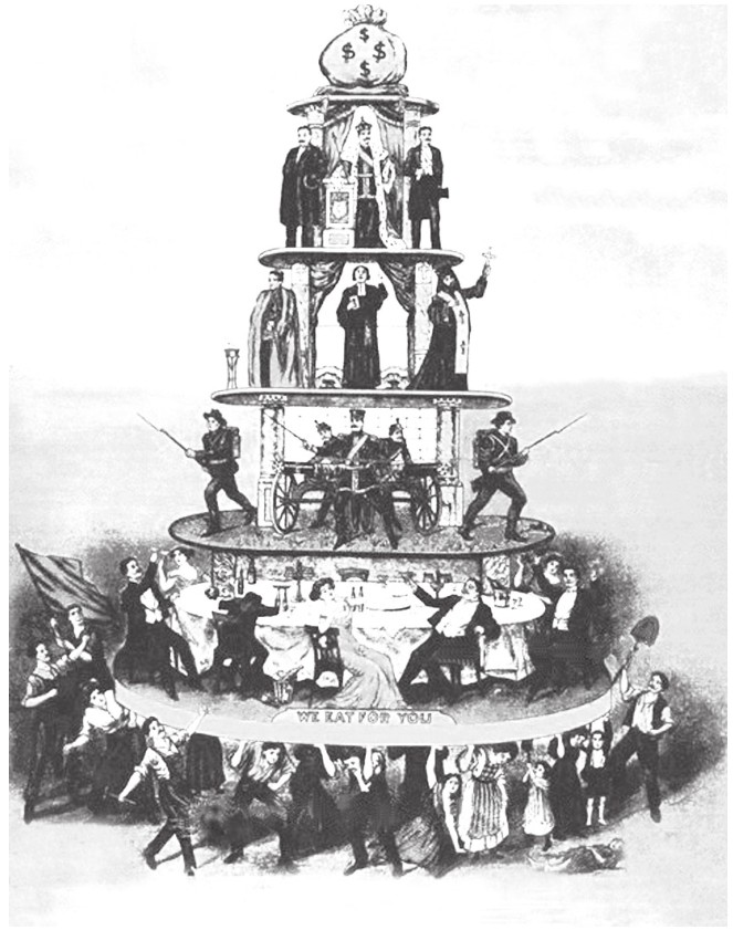 资本在循环中,依次采取货币资本、生产资本和商品资本三种形式。货币资本的职能是为资本主义生产作准备;生产资本的职能是生产剩余价值;商品资本的职能是实现剩余价值。资本只有顺利地通过购买、生产、销售三个阶段,才能实现剩余价值。本图为一幅宣传画,它夸张地展示了资本主义体系的金字塔。