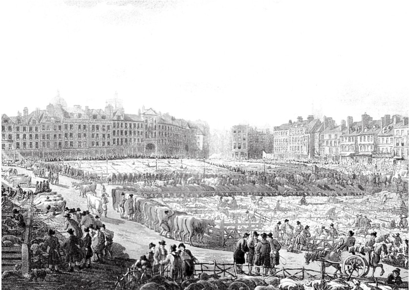 贸易的本质,是先用货币去购买一定数量的商品,再把商品换成货币。货币资本在这种循环中得以积累,其功能得到强化。图中,人们正在伦敦的史密斯肉市上忙碌地交易。