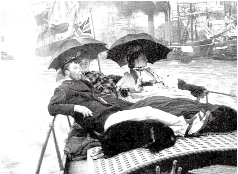 运河运输的成本相当于公路运输的四分之一到二分之一。在这种情况下,投资运河的人获得了可观的利润,也为资本节省了流通时间。图为内陆河上,人们乘坐汽船的情景。汽船是运河上的主要交通工具。
