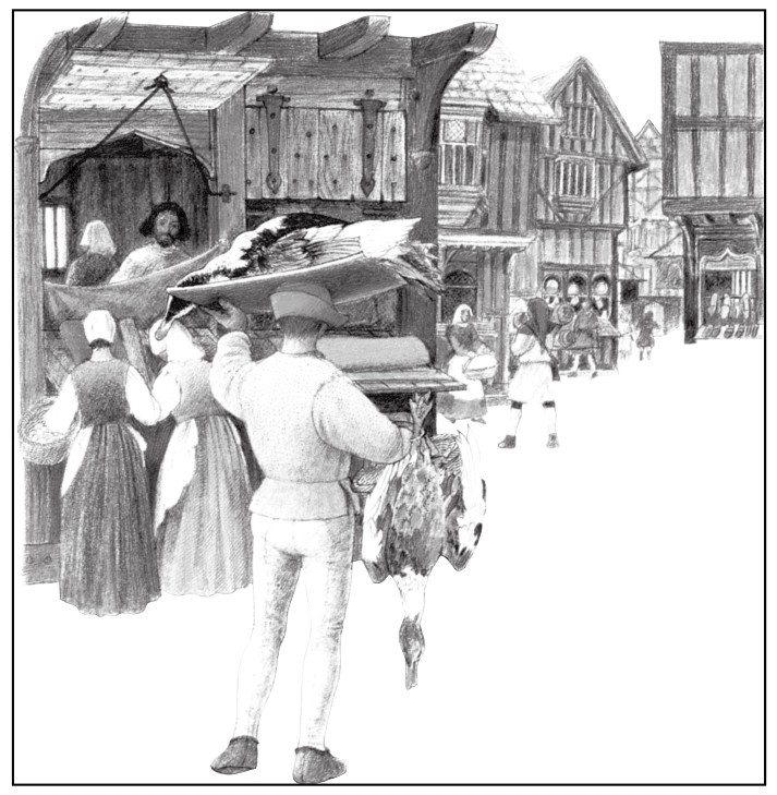 中世纪末期,欧洲商业逐步发展,拥有大量资本的商人也随之成为当时的显贵。城镇成为重要的商业中心,新兴的手工匠阶级诞生。手工匠为了掌握货物的价格和品质,成立了各种行会。图为中世纪末期欧洲小镇的街头风光,人们在从事各种商业活动。