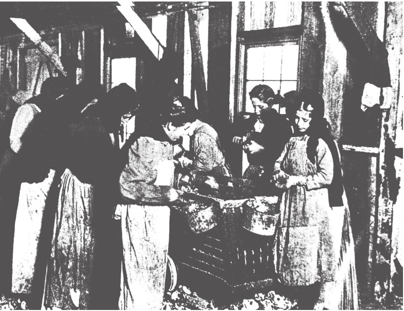 本身不增殖的资本,被资本家运用于商品生产与销售过程后,就产生了剩余价值,即资本家所追逐的利润。也就是说,不管是产业资本家还是银行资本家,他们的利润都来源于工人在生产商品过程中所创造的价值和剩余价值。图中,妇女和儿童们正在恶劣的环境中剥牡蛎,他们正源源不断地为资本家创造剩余价值,而这些剩余价值最后又转化为产业资本家和银行资本家的利润。