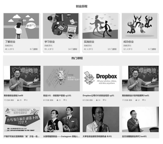 如果上网用“慕课”作为关键词搜索,大家可以看到一系列的慕课平台,除了国外做的比较火的Coursera和edX以外,我国本土也有很多专门针对就创业的慕课网站,比如“中国创新创业慕课”,在那里将创业的过程分为“了解创业、学习创业、实践创业、成功创业”四大板块,并聚集了各个商业巨头和教授进行公开课的宣讲,所以,不论学习者处于哪个阶段,都可以在这里找到与自己类似的环境,点击学习相应课程,并即时寻求到呼应和帮助。