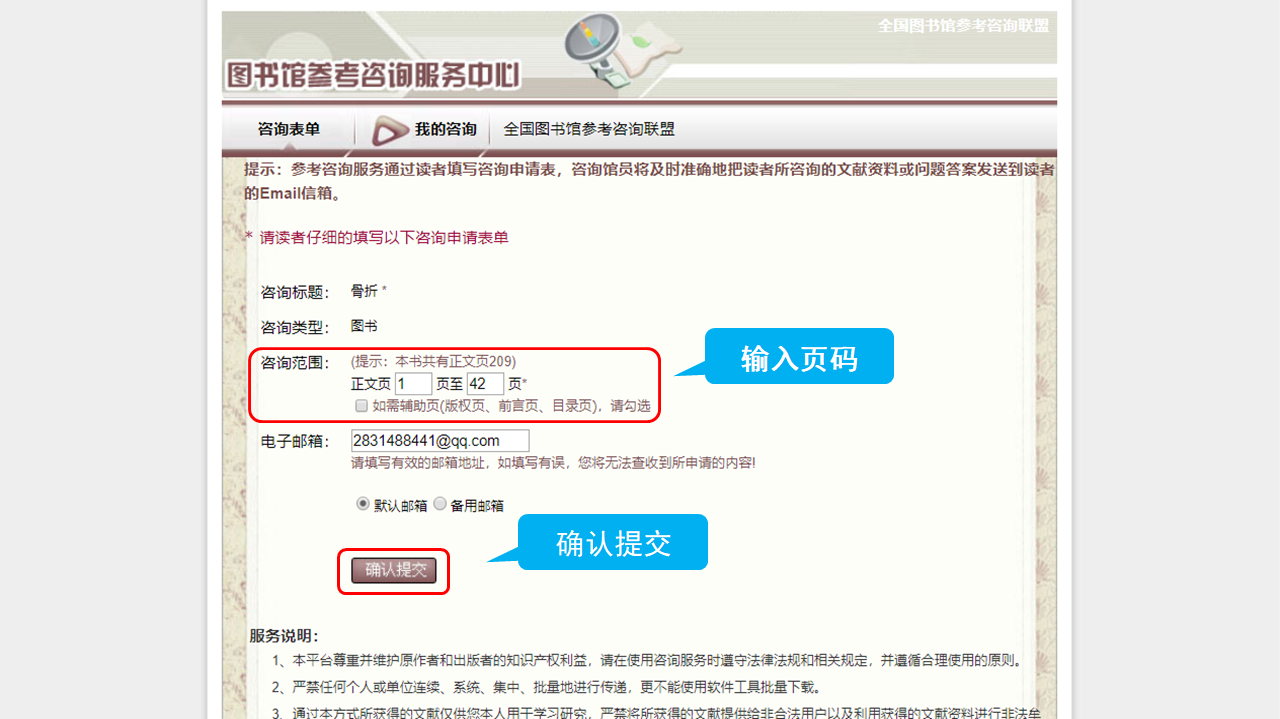 输入要传递的页数(一般不超过50页)核对邮箱(推荐使用QQ或新浪邮箱)点击【确认提交】即可。