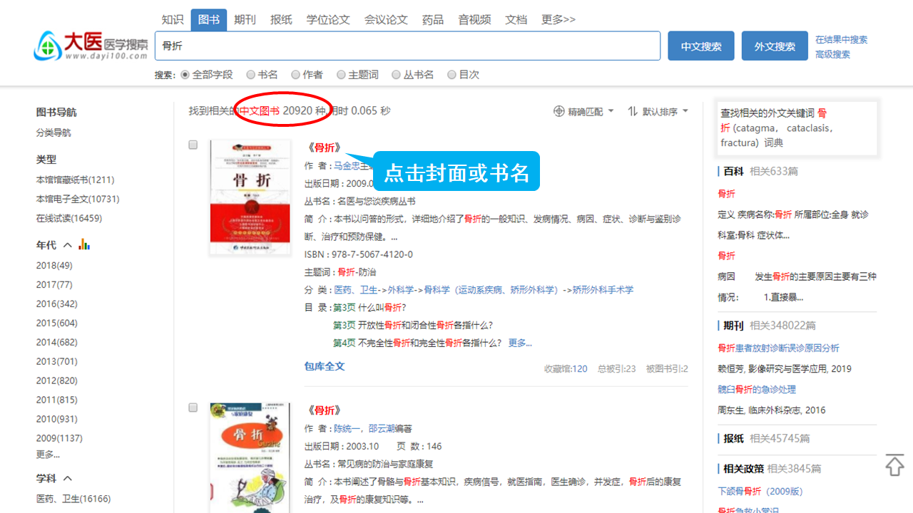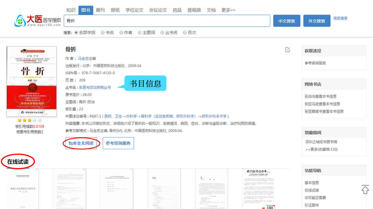 找到相关图书,点击图书的【封面】或【书名】可以进入到本书的书目信息页面。