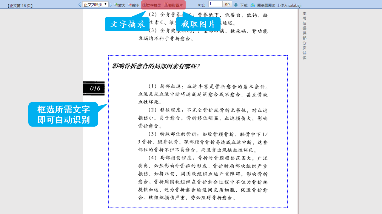 【文字摘录】对书里面的文字进行复制粘贴,点击【文字摘录】按钮,拖动鼠标框选住要复制的文字,系统自动识别,点击复制按钮即可,在本地建空白文档,鼠标右键粘贴,每一段文字的出处都会自动粘贴过来。