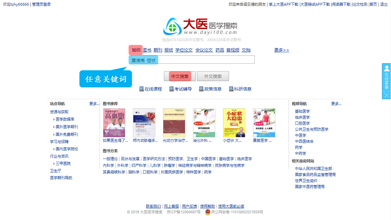 知识的搜索其实是对大医数据库里所有的图书进行一个全文级内容的检索。