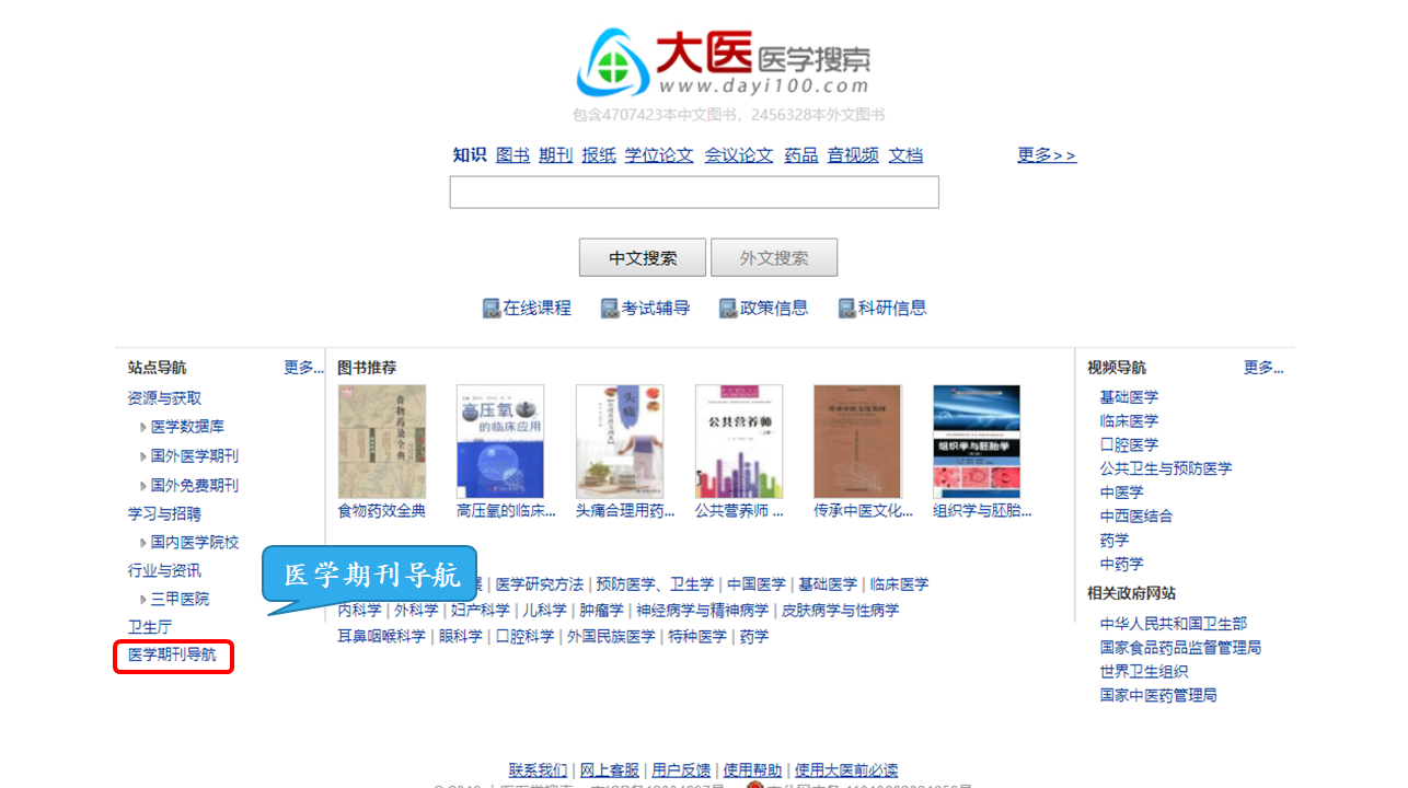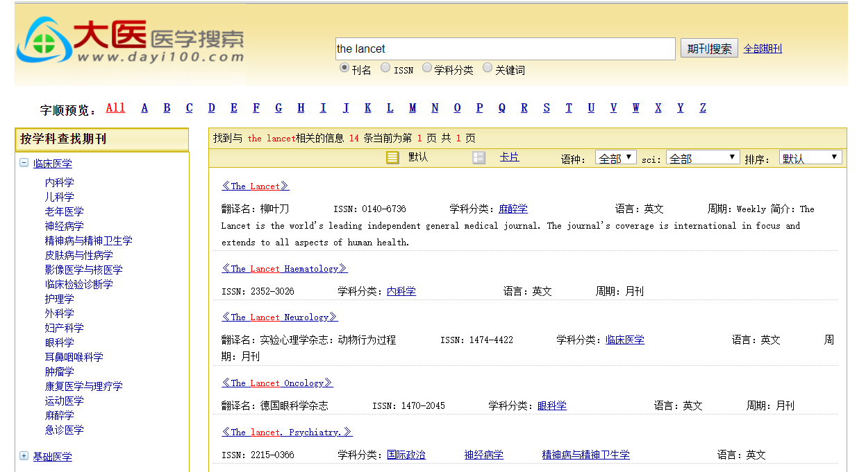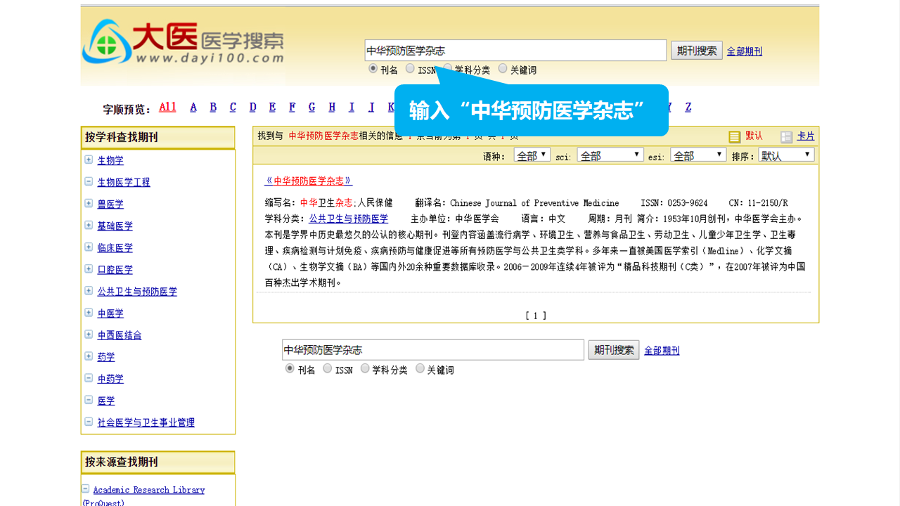 在该模块可以了解大医数据库里一共可以查询到的中外文刊有多少种。可以根据左侧“按来源查找期刊”也可通过刊名直接查找。