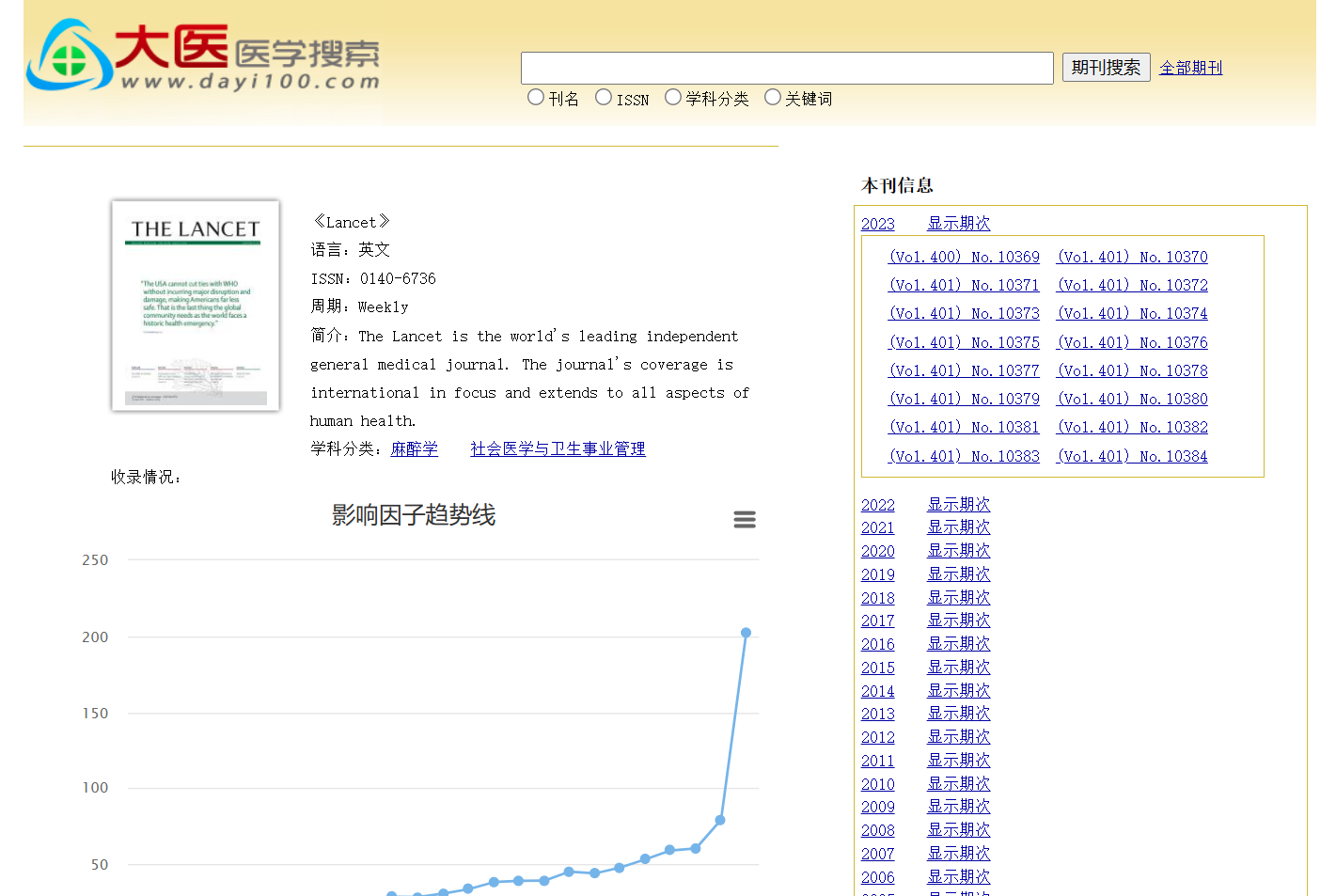 例如目前世界医学界最权威的学术刊物之一:The Lancet杂志 (中文译名《柳叶刀》)收录情况:1823-2021(创刊期-现在)