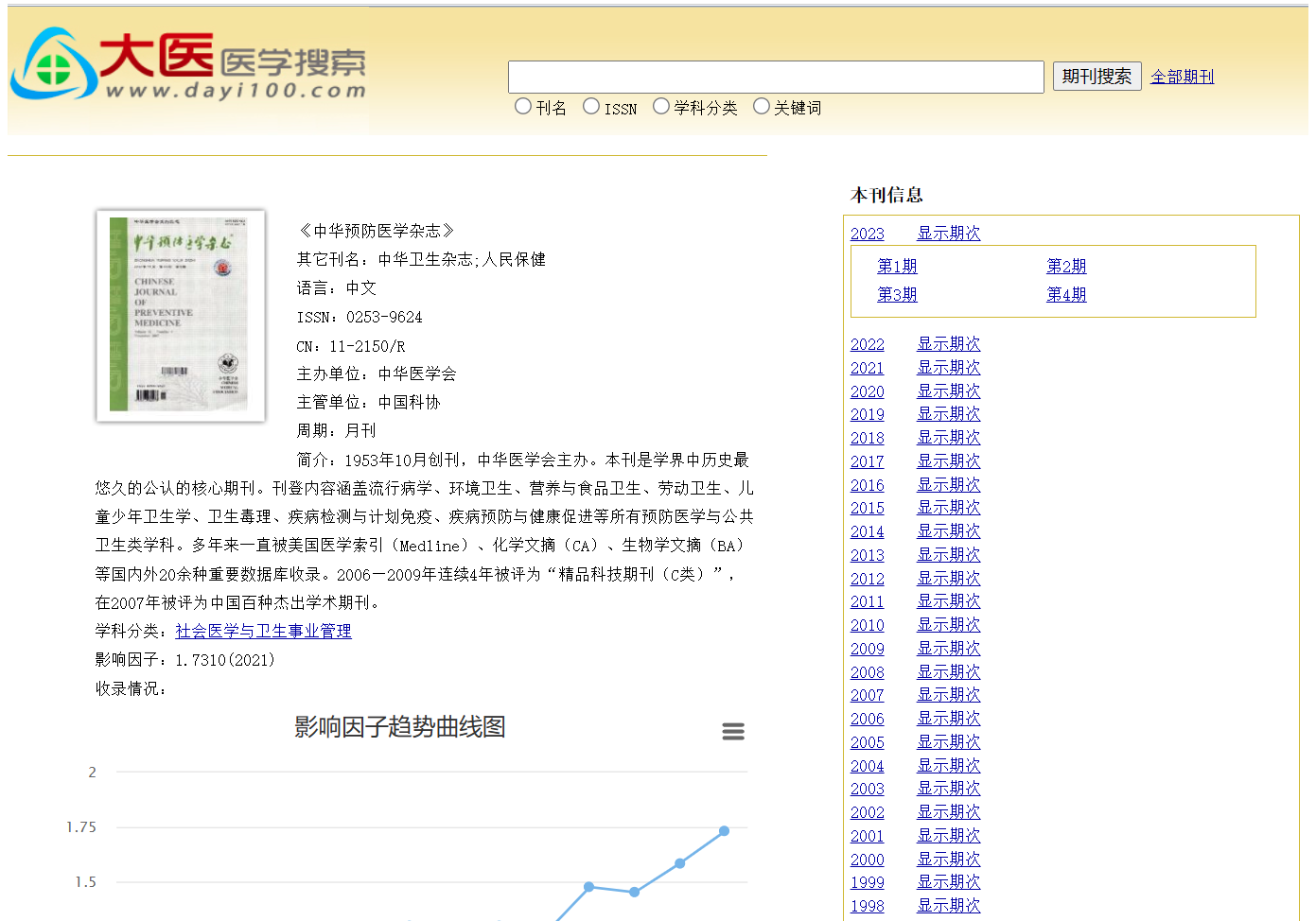 例如查找《中华预防医学杂志》,检索结果左侧大概可链接刊目信息,右侧可看到具体年代期次,点击相对应的期次,可看到该期所有文章。