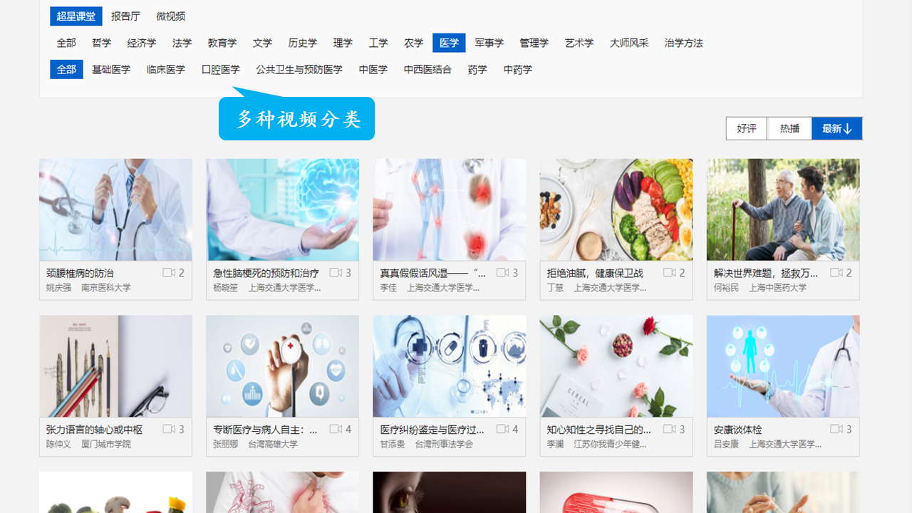 可以观看基础医学、中医学等相关学科学术视频,视频可以下载可以分享给他人。
