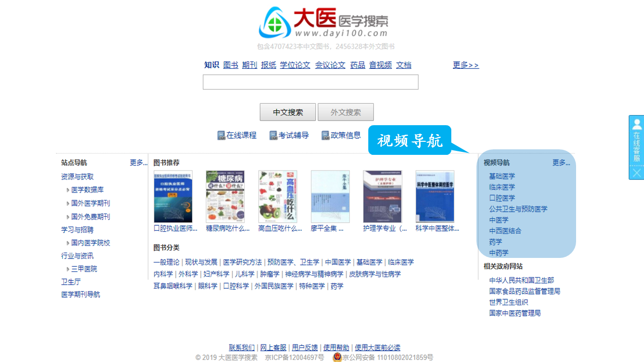 大医数据库首页右侧,找到【视频导航】模块,点击更多进入该模块。