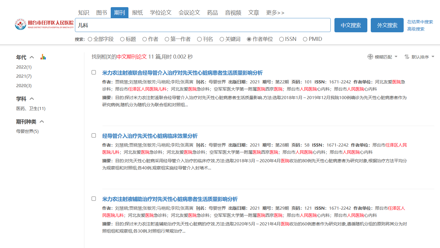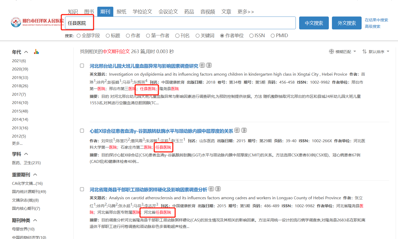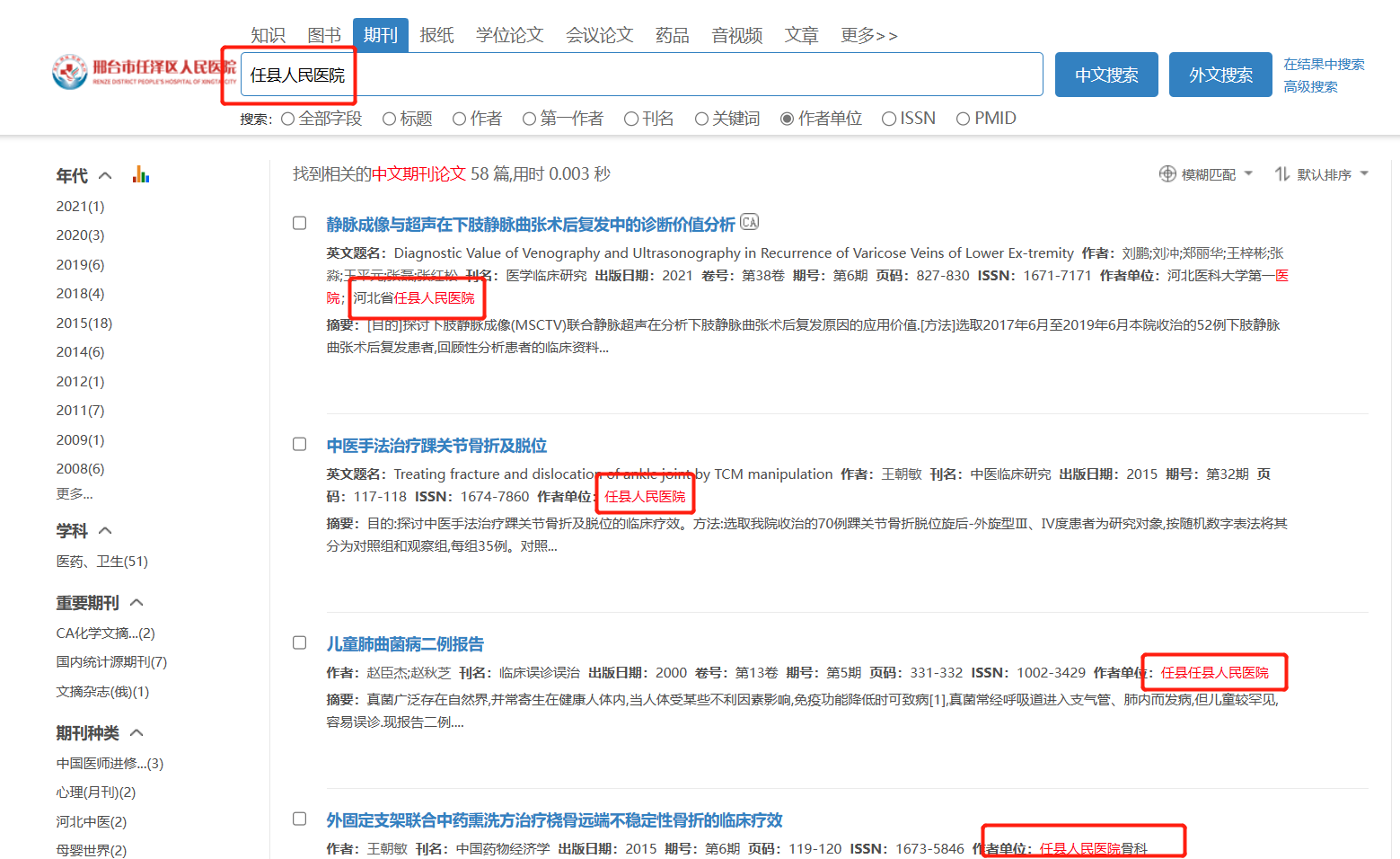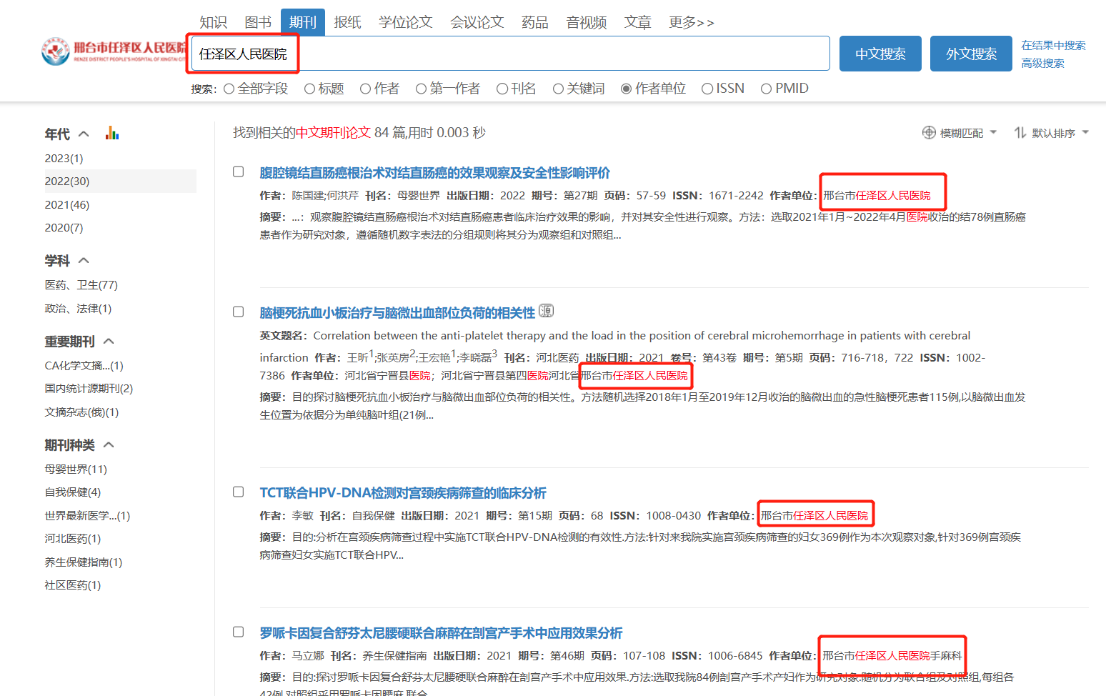 选中【期刊】频道—输入“任泽区人民医院”— 限定路径“作者单位”,点击中文搜索即可。