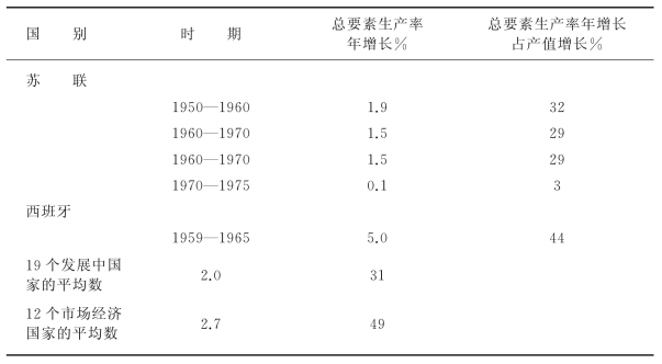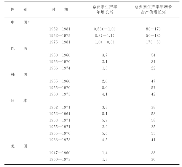 通过材料使用和总要素生产率的国际比较可以看出,中国为经济增长所付出的代价是非常高昂的。表3.8、表3.9和表3.10中的数据表明,中国经济增长的效率很低。其中,按单位国内生产总值计算的能源、钢材消耗和所需运输量,分别超过其他发展中国家的63.8%—229.5%、11.9%—122.9%和85.6%—559.6%;按主要产品的单位工业产值计算,除印度的钢材消耗量略高于中国外,其他情形大致相同;同发达国家比,差距就更大了。在资产总量构成中,中国流动资金占全部资产总量的份额最大,高出其他国家4.8—25.7个百分点,这意味着中国投入品与产出品的库存量比其他国家多,库存时间比其他国家长。反映经济增长代价高昂最重要的指标是总要素生产率增长太慢。在1952—1981年间,即便采取最有利的假设,中国的总要素生产率年均增长也仅为0.53%,是表中所列各国中增长最慢的国家。据世界银行的估计,在1957—1982年间,中国国有企业的总要素生产率处于停滞或负增长状态。