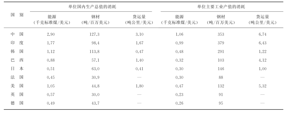 表3.8 单位国内生产总值、主要工业产值材料消耗率的国际比较(1980年美元)