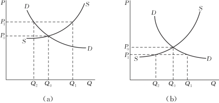 下生产(如图3.3(a)所示),另一类部门是在低于均衡水平的计算价格下进行生产(如图3.3(b)所示)。在前一种情形下,由于生产部门获得较高的计算价格,提供大于均衡水平的产品,剩余量为Q0Q1。