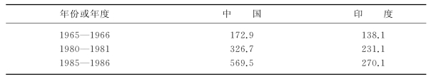 资料来源:国家统计局:《中国统计年鉴(1993)》,北京:中国统计出版社1993年版,第33页;孙培均主编:《中印经济发展比较研究》,北京:北京大学出版社1991年版,第57页。