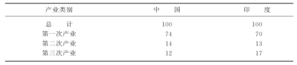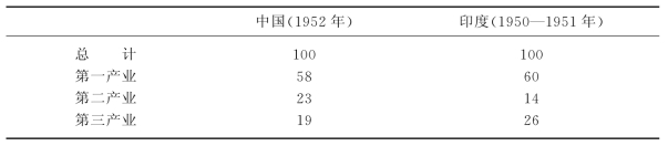 第三,中国和印度的资源条件没有明显差异。中印两国的资源比较优势都是劳动力相对丰富,农业生产条件都有降水量季节分配和地区分布不均匀的特点,等等。第四,中国和印度经济发展的起点大体相似。50年代初,中印两国的经济结构是极为相似的。从农业看,1952年,中国国民收入中农业所占的份额为57.7%,农村人口占全国总人口的比例为87.5%;1950—1951年度,印度的这两个指标分别为59%和82.7%。从总体上看,中国第二次产业相对大一些,而印度第三次产业相对大一些,但差异并不显著(参见表3.11)。