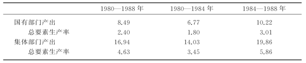 首先让我们考察经济激励的改进。1978年以前,虽然城市以国有经济为主,农村以集体经济为主,存在着显著的差异,然而它们在经济激励低下这一点上却并无二致。这既是那个时期城乡经济均无起色的主要原因,也是拥有劳动力丰富、相对廉价之比较优势的农村,对经济增长的贡献非常有限的主要原因。1978年实行经济改革以来,中国的情况发生了一系列变化。尤其是农村以家庭联产承包责任制取代生产队的集体生产体制,极大地激发了农民的生产积极性。1978—1984年间农村生产每年平均增长4.8%,为1952—1978年间年均生产增长率的2倍。根据计量研究,由于生产积极性的提高,家庭农场的生产率约比生产队体制高20%,1978—1984年间的农业增长中有一半可归功于推行家庭联产承包责任制所激发出来的农民的生产积极性。①放权让利式的微观经营机制改革和资源配置制度改革,也同样改进了国有企业的激励机制,进而提高了生产经营效率,后者可以用总要素生产率的提高加以说明。据经济学家杨坚白估计,改革前26年(1953—1978年)中国的总要素生产率平均为负增长(其中1953—1957年总要素生产率为0.77%,对经济增长的贡献率为8.7%);②1979—1989年中国的总要素生产率和它对经济增长的贡献率分别为2.48%、28.5%。③总要素生产率由负数到接近2.5%,仅此一项就可以说明改革以来经济发展加速的一半以上。世界银行所作的一项研究也获得了类似的结论(参见表6.1)。