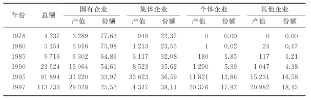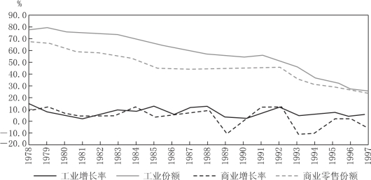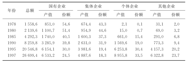 从表6.2、表6.3可以看出,无论是在工业产值结构中还是在社会商品零售总额中,非国有经济所占的份额都在持续增长。其中,非国有经济占工业产值的份额已由1978年的22.4%提高到1997年的74.5%,提高了52.1个百分点;占社会商品零售总额的份额由45.4%提高到75.5%,提高了30.1个百分点。需要指出的是,这一时期国有工业、国有商业的增长并没有下降(参见图6.1)。非国有经济占经济总量的份额增加,是它比国有经济发展得更快引起的。上述数据表明,改革以来国民经济的快速增长具有主要依靠新生出来的非国有经济为动力的特征。