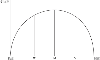 加以说明(图9.3)。假定社会对于改革的态度可以划分为强调稳定(中位线左方)和强调速度(中位线右方)两类,在领导层相应形成两种有分歧的改革主张(W和S)。对改革持比较极端态度的社会成员,具有比较明确的支持对象,处于W左方的和处于S右方的分别支持W和S主张。在两种政策主张都不作修正的情况下,其余社会成员倾向于以中位线为界,分别支持W和S。从图9.3中可以看出,如果W和S中任一方朝着对方的方向修正意见,就可以通过中位线向对方移动使自己获得更多的支持。在双方都作这样选择的情况下,就减轻了两种改革主张的极端程度。一方面,稳定主张者也关心速度,另一方面,速度主张者也要讲稳定。