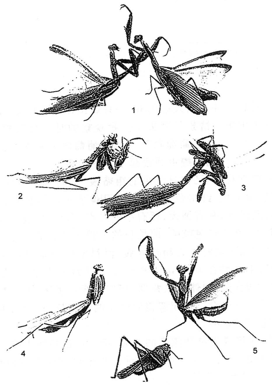 1.两只雌性螳螂在打斗 2.螳螂在吃蝗虫 3.交尾后雌螳螂在吃雄螳螂 4.螳螂在做祈祷状 5.螳螂的张牙舞爪魔怪状