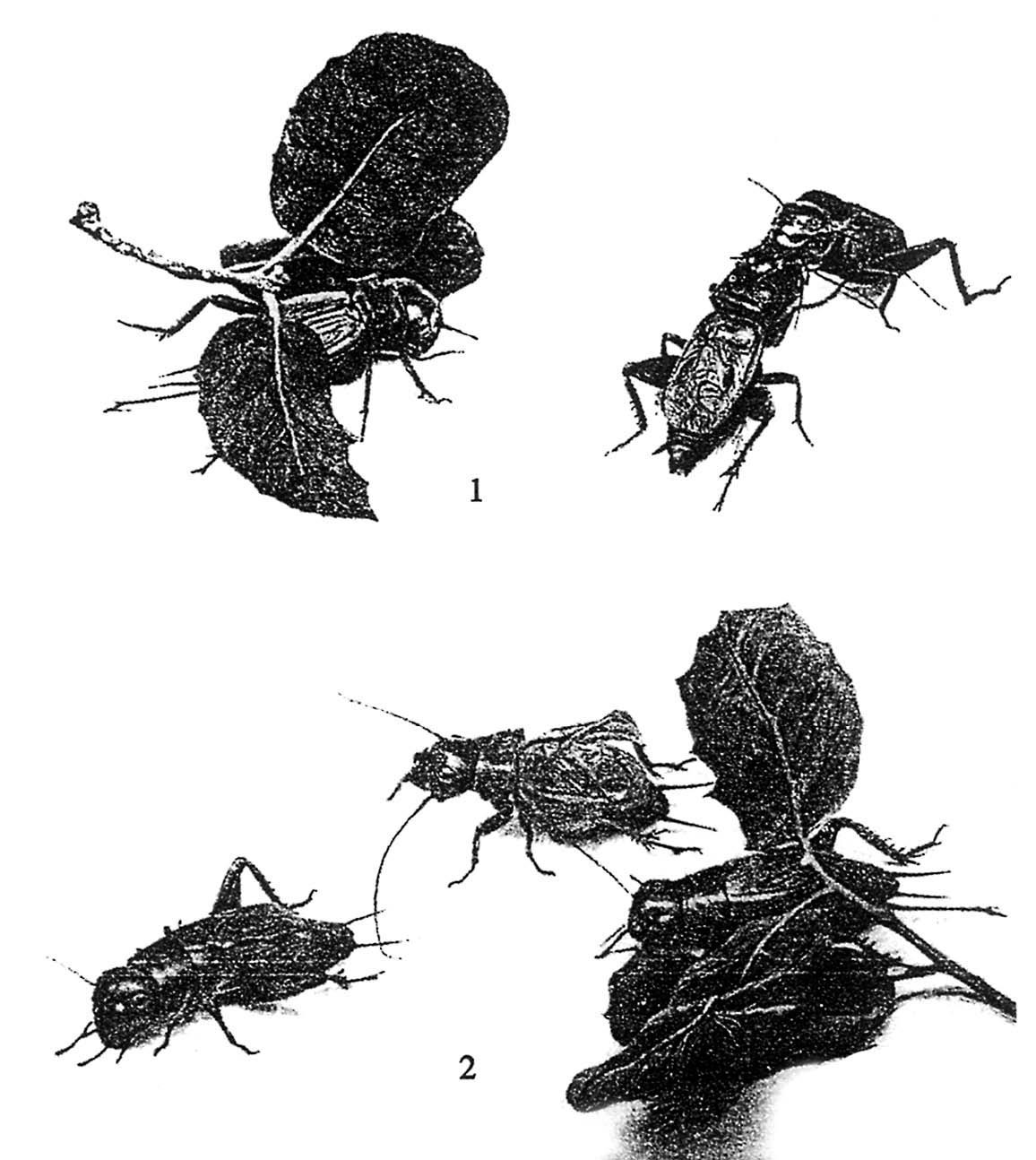 求欢者很会搔首弄姿。它手指一勾,把一根触须拽回到大颚下面,把它蜷曲起来,用其唾液作为美发霜在其上涂抹。它那尖钩、镶着红饰带的长长的后腿,焦急地跺着,向空中蹬踢着。它因激动而唱不出声来。它的鞘翅在急速地颤动着,但却不再发出声响,或者只是发出一阵零乱的摩擦声。