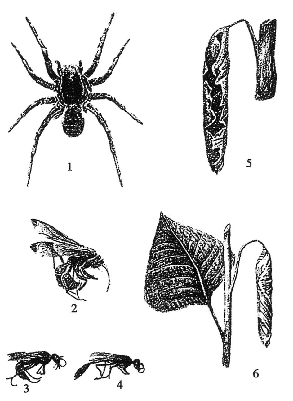 1.纳尔包那狼蛛 2.环节蛛蜂 3.毛刺沙泥蜂 4.沙地砂泥蜂 5.葡萄卷叶象 6.杨树象