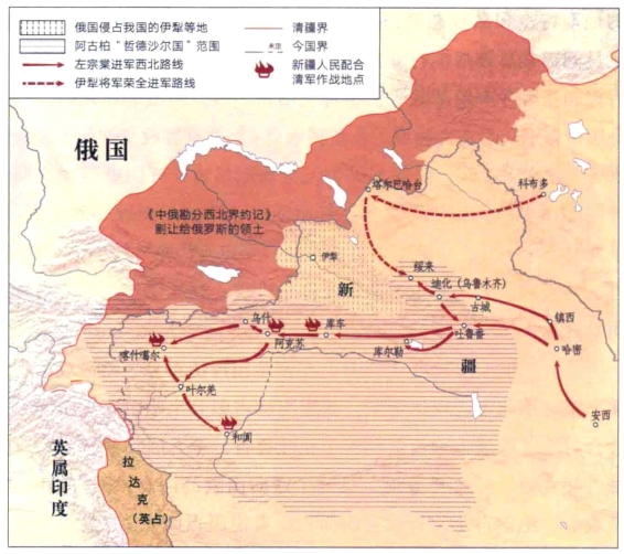 19世纪中叶,英、俄两国加紧对中亚地区的殖民争夺,并觊觎我国的新疆。清同治四年(1865年),在英国的支持下,中亚浩罕汗国(在今乌兹别克斯坦费尔干纳地区)的军事头目阿古柏侵入新疆,自立为“汗”,随后侵占了南疆全部区域与北疆的部分地区。清同治十年(1871年),俄国又出兵占领了伊犁,新疆面临被肢解的威胁。
