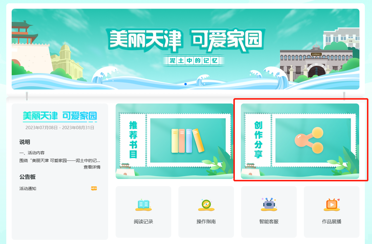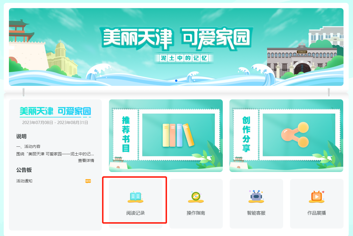 登录后,选择“教育技术与信息化”模块,进入“2023年天津市中小学生暑期专项智慧阅读活动”页面。进入活动页面后,可查看活动时间、说明、公告等。