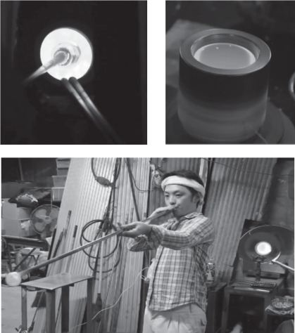 玻璃的加工过程包括配料、熔化、成形、退火等工序。配料和熔化是一般将制作玻璃的原料经过高温加热形成无气泡的玻璃液。在熔化时除了基本原料外,还会用到一些辅助的熔剂,熔剂包括助熔剂、澄清剂、乳浊剂、脱色剂。助熔剂可以帮助降低各物质形成时的黏度,使玻璃更易融化。辅助熔剂因种类不同,达到的效果有所不同,有的助熔剂还可以增加玻璃对光的折射率,降低玻璃对光的散射率,让玻璃对光的折射更稳定。澄清剂是减少玻璃在熔化时产生的气泡,有时候根据需要可能会保留玻璃中的气泡,这种情况下就不需要加入澄清剂。乳浊剂是根据要求使玻璃产生结晶或者不固定的胶体颗粒,从而玻璃产生不透明的效果。脱色剂是用来消除玻璃中杂质让玻璃产生颜色的。玻璃的熔化在熔窑中进行,熔窑分为坩埚窑和池窑。坩埚窑适合小批量生产,池窑适合大批量生产。成形方式有机械成形和人工成形两种。人工成形可以采用吹塑的方式,人与玻璃液之间隔着一根镍铬合金吹管,用嘴对着吹管边转边吹,完成泡、球或是不规则的形状的吹塑。玻璃管的成形一般采用拉制,将吹成小泡状的玻璃液,一端用顶盘吸住,一端边吹边拉实现对玻璃管的成形(图2.11)。压制成形是将玻璃液剪下一段放入模具中压制而成。自由成形是用剪子、镊子、钳子等工具直接塑造形状(图2.12)。人工成形有其不可替代的优点,人工成形可能做出的每一个产品都是独一无二的,人工生产出的玻璃制品给人更有温度的感觉。但是,机械成形能够减少人类机械的劳动方式,效率高是机械成形的优点。机械成形除了吹塑、拉塑、压塑外,还有压延成型、浇铸成型、离心成型、烧结成型。最后一步是退火,由于玻璃制品是在高温下成形的,如果直接降温会导致冷爆现象的产生,因此要在恒定温度内保温或者是逐渐降温,使得玻璃材质中的热应力保持到允许值。