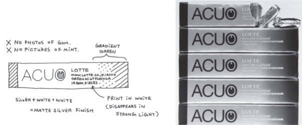 设计的表现形式多样,与文章表达相似,有平铺直叙的设计,也有借助修辞的设计。用颜色表达产品想要阐述的语言就像是设计中的修辞手法。佐藤大为口香糖品牌LOTTE设计ACUO包装(图4.15),是以一段逐渐消失的绿色表达薄荷清凉的口感,包装简单低调,并没有大张旗鼓地宣扬这款产品可以去除口臭,但却达到了相同的效果。正是因为绿色是代表清新的颜色,所以与其平铺直叙口香糖的作用,不如用颜色代表口香糖的功能,使购买者产生共鸣。