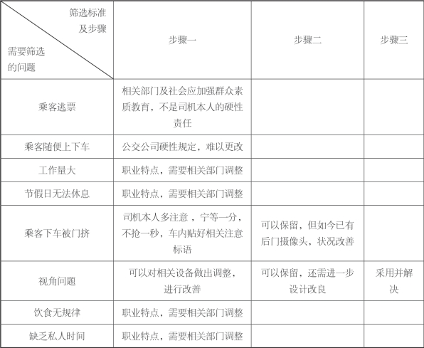 筛选分析:许多制度和现实发生了冲突,会对公交司机造成影响,分散了司机的注意力。司机与乘客之间的矛盾很多是由实际情况与制度不符导致的,所以问题大致可分为两类:一类是由于公交制度导致和公交司机产生了问题;二类是公交车内司机日常接触的产品导致驾驶度不好。我们无法去改变现有的制度,只能通过解决公交车上设施或者给司机减轻心理负担,最后我们确定的是解决视角问题。