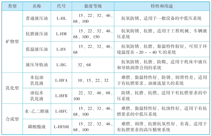 表1-2 我国液压油的主要品种、黏度等级及特性和用途