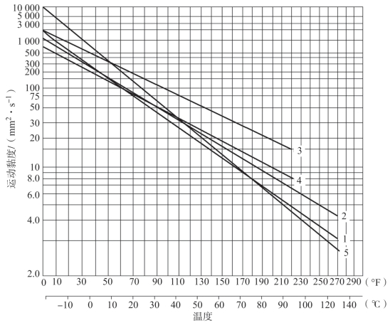 1—矿油型通用液压油;2—矿油型高黏度指数液压油;3—水包油乳化液;4—水-乙二醇液;5—磷酸酯液