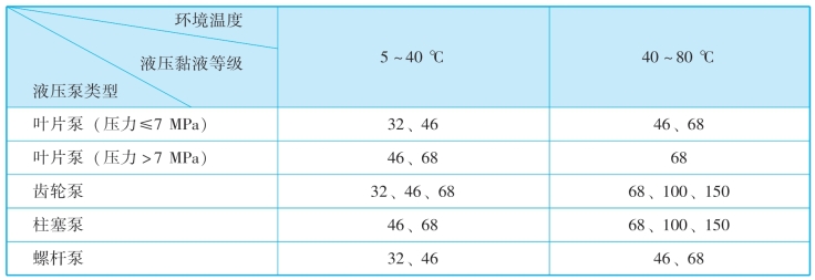 液压泵是液压系统的重要元件,它对液压油黏度的要求较高。一般情况下,可将液压泵要求的黏度作为选择液压油的基准。液压泵用油黏度如表1-1所示。