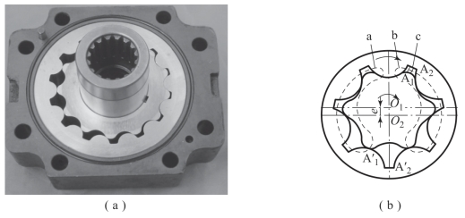 图2-8所示为内啮合齿轮泵的实物及工作原理。它是由配油盘(前、后盖),外转子(从动轮)和偏心安置在泵体内的内转子(主动轮)等组成的。内、外转子相差一齿,图2-8(b)中内转子为六齿,外转子为七齿,由于内外转子是多齿啮合,这就形成了若干密封容积。当内转子围绕中心O1旋转时,带动外转子绕外转子中心O2做同向旋转。这时,由内转子齿顶A1和外转子齿谷A2间形成的密封容积c(图中阴线部分),随着转子的转动密封容积逐渐扩大,于是就形成局部真空,油液从配油窗口b(虚线围成部分)被吸入密封腔,至A′1、A′2位置时封闭容积最大,这时吸油完毕。