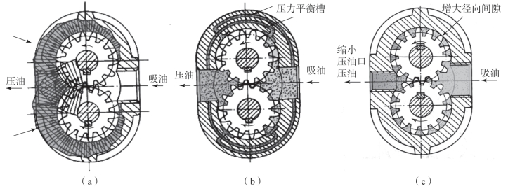 (a)齿轮泵所受不平衡的径向力;(b)齿轮泵的压力平衡槽;(c)减小径向不平衡力的措施