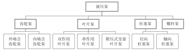 常用的容积式泵类型按输出流量是否可调可分为定量泵和变量泵,按输出液流的方向分为单向泵、双向泵,按液压泵的结构分类如图2-2所示。