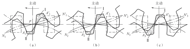 齿轮泵要能连续地供油,就要求齿轮啮合的重叠系数ε大于1,也就是当一对齿轮尚未脱开啮合时,另一对齿轮已进入啮合,这样,就出现同时有两对齿轮啮合的瞬间,在两对齿轮的齿向啮合线之间形成了一个封闭容积,一部分油液也就被困在这一封闭容积中[见图2-9(a)],齿轮连续旋转时,这一封闭容积便逐渐减小,到两啮合点处于节点两侧的对称位置时[见图2-9(b)],封闭容积为最小,齿轮再继续转动时,封闭容积又逐渐增大,直到图2-9(c)所示位置时,容积又变为最大。在封闭容积减小时,被困油液受到挤压,压力急剧上升,使轴承上突然受到很大的冲击载荷,使泵剧烈振动,这时高压油从一切可能泄漏的缝隙中挤出,造成功率损失,使油液发热等。当封闭容积增大时,由于没有油液补充,因此形成局部真空,使原来溶解于油液中的空气分离出来,形成了气泡,油液中产生气泡后,会引起噪声、气蚀等一系列恶果。以上情况就是齿轮泵的困油现象,这种困油现象极为严重地影响着泵的工作平稳性和使用寿命。