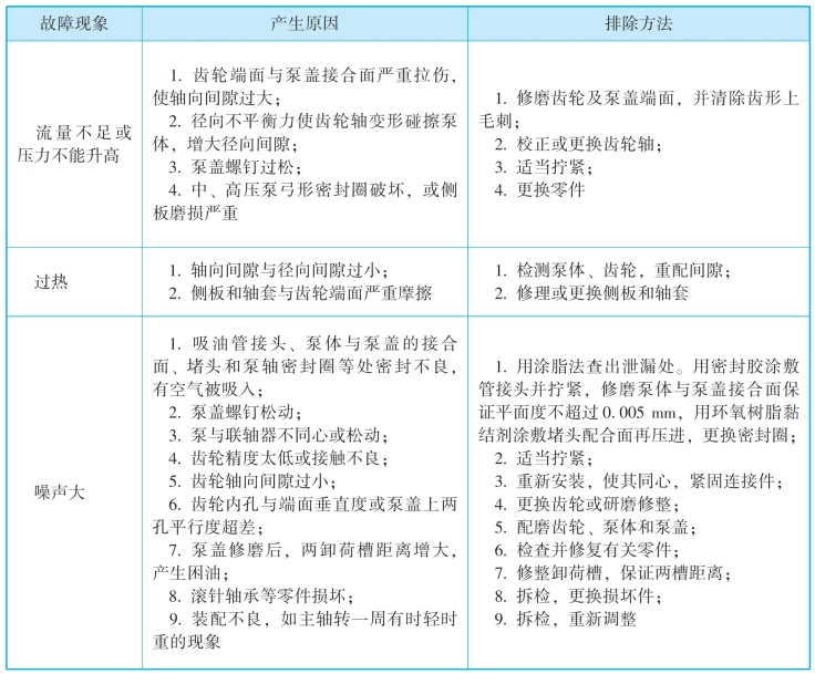 表2-2 齿轮泵的常见故障及排除方法