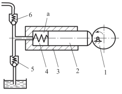 1—偏心轮;2—柱塞;3—缸体;4—弹簧;5,6—单向阀;a—密封容积