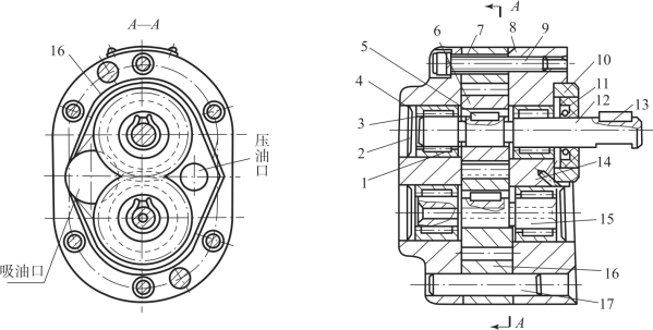 1—轴承外环;2—堵头;3—滚子;4—后泵盖;5,13—键;6—齿轮;7—泵体;8—前泵盖;9—螺钉;10—压环;11—密封环;12—主动轴;14—泄油孔;15—从动轴;16—泄油槽;17—定位销