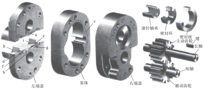 a,b—槽;c—压力卸荷槽;d,e—孔;f,g—困油卸荷槽;h—进油口;i—出油口