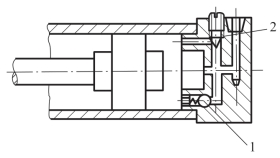 为了避免活塞运动到终点时撞击缸盖,产生噪声、影响活塞运动的精度甚至损坏机件,常在液压缸两端设置缓冲装置。缸盖常见的缓冲装置是应用节流原理来实现缓冲的。活塞端部圆柱塞进入到端盖圆孔时回油口被堵,无杆腔回油只能通过节流阀2回油,调节节流阀的开度,可以控制回油量,从而控制活塞的缓冲速度,如图3-16所示。