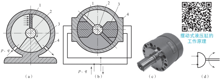 (a)单叶片式摆动液压缸;(b)双叶片式摆动液压缸;(c)摆动缸实物;(d)图形符号p—工作压力;q—输入流量;