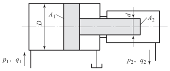 由于双杆活塞缸两端的活塞杆直径通常是相等的,因此它左、右两腔的有效面积也相等,当分别向左、右腔输入相同压力和相同流量的油液时,液压缸左、右两个方向的推力和速度相等。当活塞的有效工作面积为A,活塞直径为D,活塞杆的直径为d,液压缸进、出油腔的压力为p1和p2,输入流量为q时,双杆活塞缸的推力F和速度v为